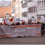Begonnen haben wir am Hauptbahnhof, wo ver.di in einer Rede klar gemacht hat, dass diese Kürzungen den kompletten öffentlichen Sektor betreffen werden und die Beschäftigten das schon jetzt deutlich spüren. Danach haben wir als Klimatreffen eine Rede gehalten, in der wir den Bezug zwischen der Aufrüstung und der Kürzungen aufzeigten. „Bei der Rüstung sind sie fix, für die Bildung tun sie nix!“. Zudem kritisieren wir ganz klar das Verhalten des Gemeinderats. Anstatt sich gegen den Sparzwang des Bundes zu stellen, führen diese einfach durch und geben dabei mit ihrem Rasenmähermodell die Verantwortung an die Verwaltung ab. Das geht gar nicht!